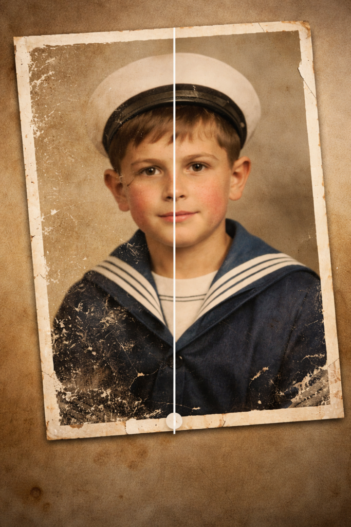 Las fotos antiguas no solo se deterioran con el tiempo: también sufren por humedad, dobleces, manchas, arañazos, roturas o una pobre digitalización. La restauración consiste en recuperar y mejorar lo que la imagen ya tenía, manteniendo la estética y esencia propia de la foto.